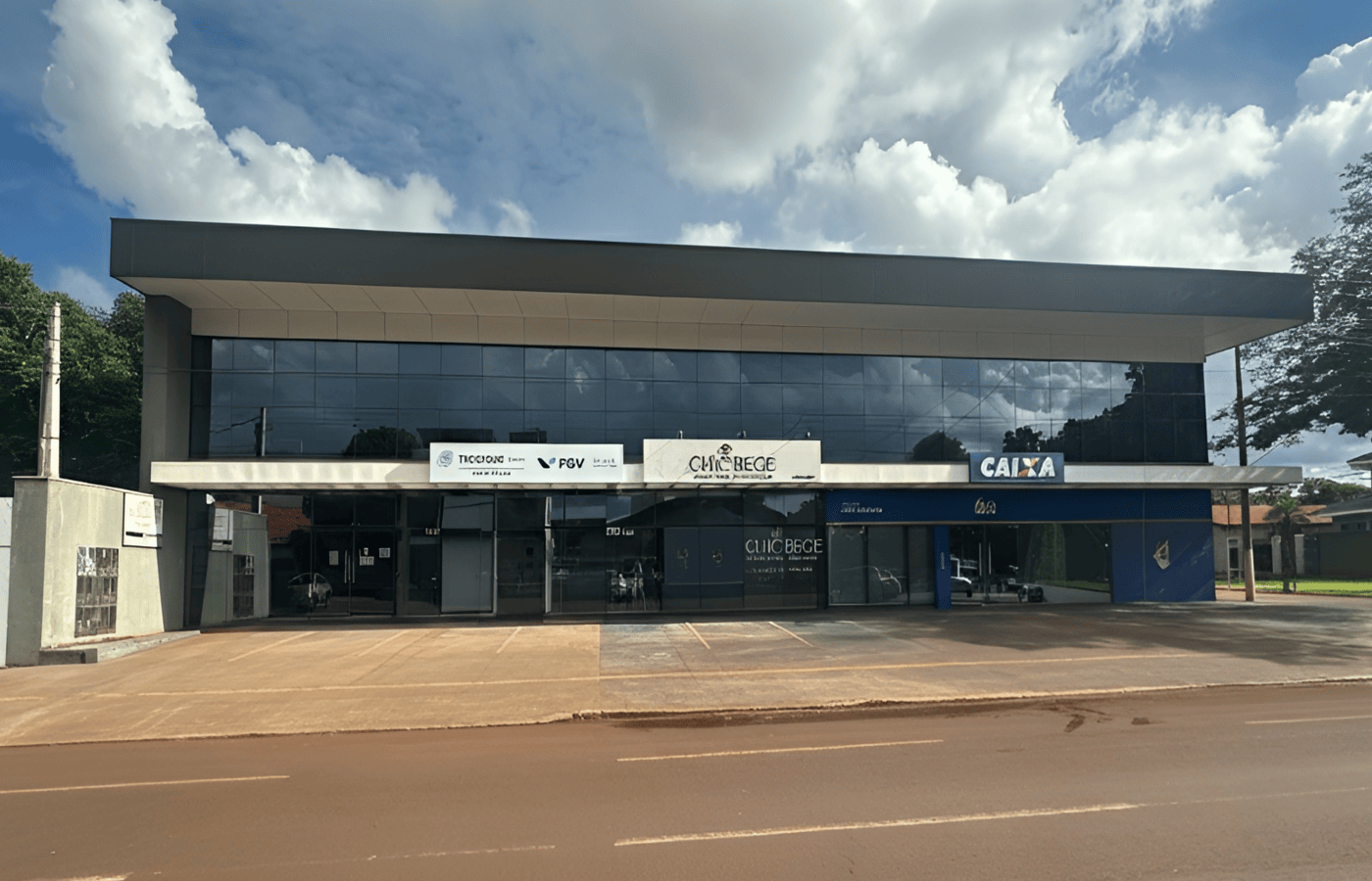 Edifício comercial de linguagem contemporânea e volumetria horizontal, caracterizado por uma fachada envidraçada que prioriza a transparência e a integração visual. A implantação linear organiza o programa em dois níveis: o térreo, voltado ao atendimento direto ao público com acessos independentes para múltiplas conveniências, e o pavimento superior, protegido por uma pele de vidro reflexiva que garante privacidade e eficiência térmica para as áreas administrativas. O projeto destaca-se pelo aproveitamento do recuo frontal para estacionamento técnico e pela setorização clara dos fluxos institucionais.