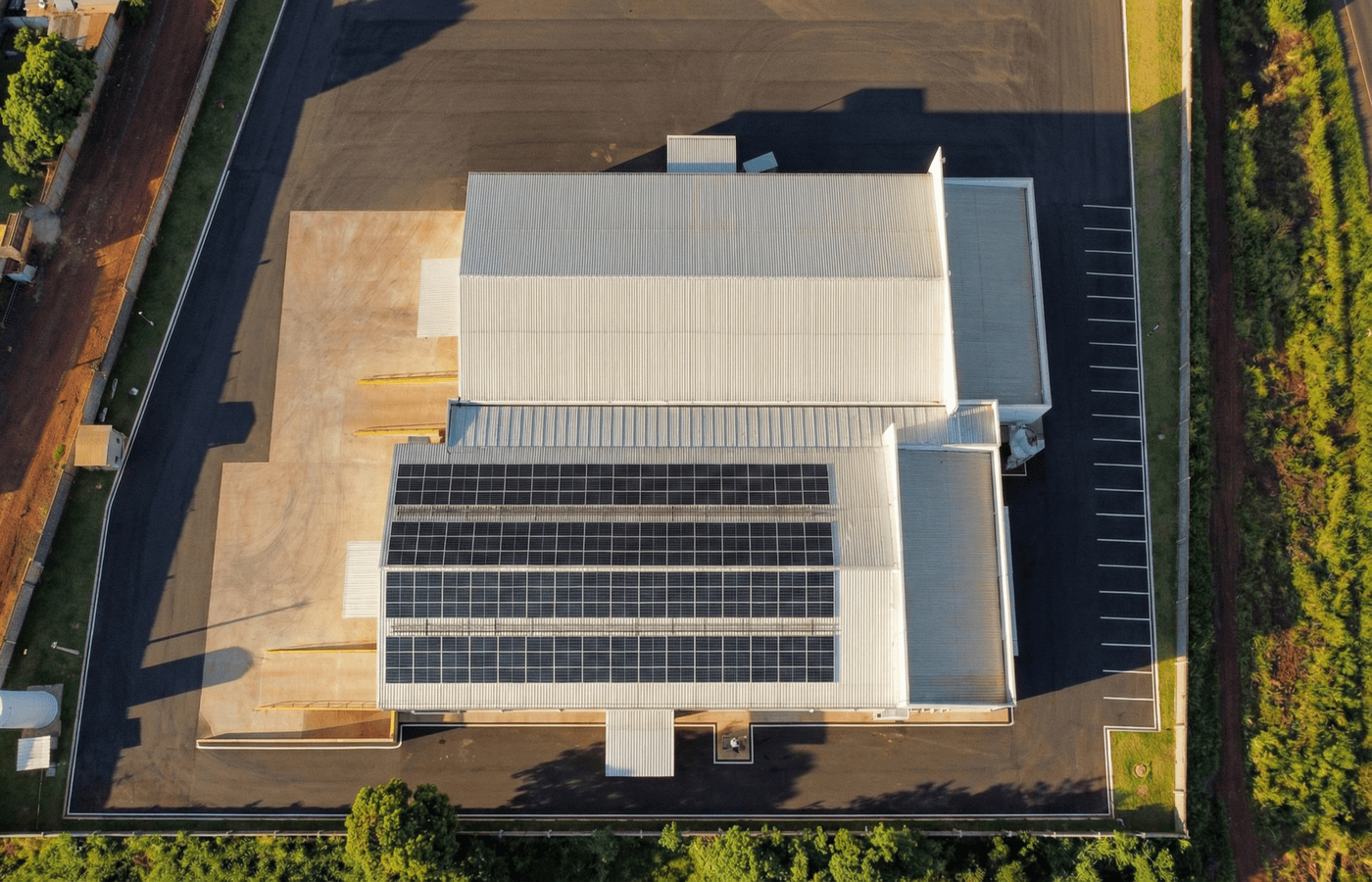 Edifício industrial com implantação isolada, projetado para atividades logísticas e armazenamento de alto desempenho. A edificação apresenta uma volumetria robusta com telhamento metálico e sheds para ventilação e iluminação natural, complementada por um sistema de energia solar fotovoltaica de grande escala, visando a autossuficiência energética e sustentabilidade. A planta baixa privilegia o fluxo operacional com amplas áreas de manobra pavimentadas em asfalto, múltiplas docas de carga e descarga integradas ao pátio e estacionamento perimetral organizado. A infraestrutura é voltada para a otimização de processos industriais, segurança patrimonial e controle rigoroso de acessos, consolidando o empreendimento como um ativo estratégico para operações de médio e grande porte.
